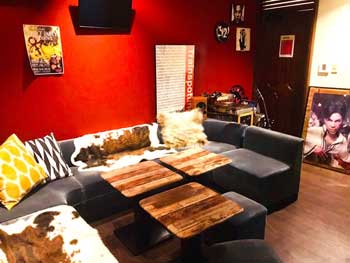 カウンター席とソファ席があります。DIYでリニューアルされた店内は赤を基調とした佇まい。昭和歌謡の歌手の写真の中にプリンスの写真がチラホラと。